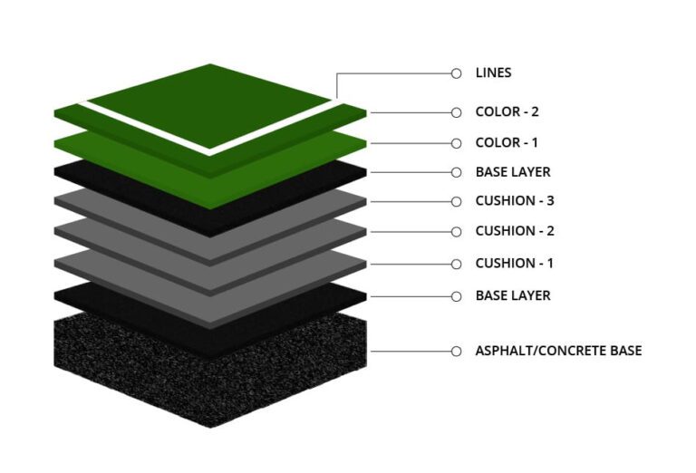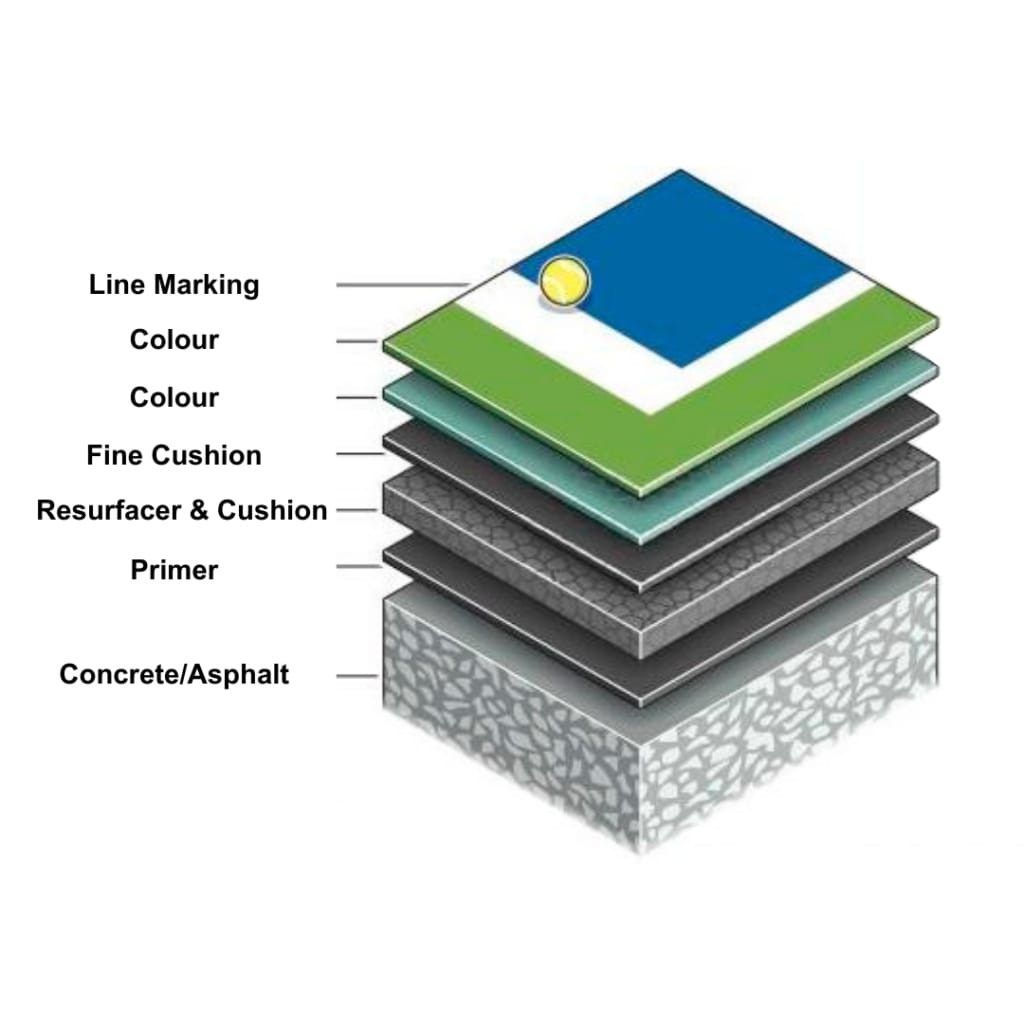 System consist of Primer, Resurfacer, 3 Layer of Cushion, 2 Layer of Colour Base coat and 1 Layer of Top UV Protected Colour Coat with Line Marking
